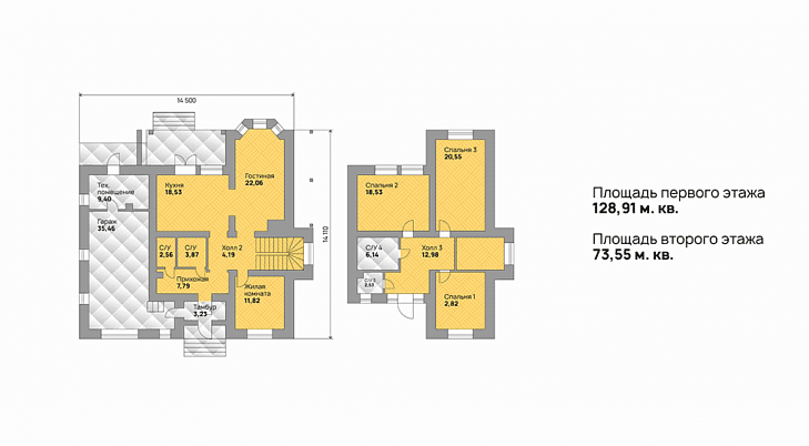 -общая площадь 145 -жилых комнат 5 -габариты дома 14х14 -отличный вариант недорогого и комфортного жилья для вашей семьи. В двухэтажном доме (размером 14 x 14 м) выполнено удачное зонирование планировки и для каждого предусмотрены необходимые комнаты. В проекте 5 жилых комнат, которые можно использовать для спальни или отдельной игровой зоны для ребенка