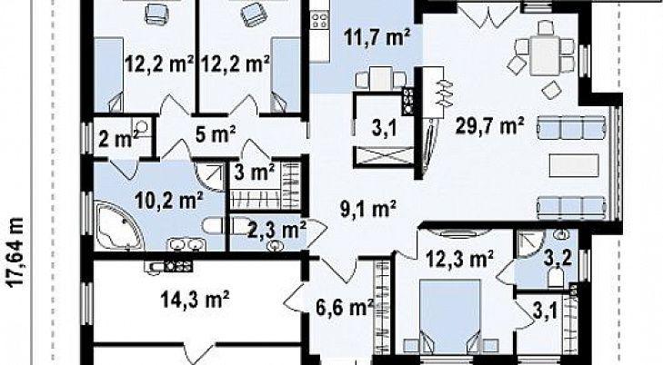 -общая площадь 176 -жилых комнат 4 -габариты дома 15х15 -отличный вариант недорогого и комфортного жилья для вашей семьи. В одноэтажном доме (размером 15 x 15 м) выполнено удачное зонирование планировки и для каждого предусмотрены необходимые комнаты.