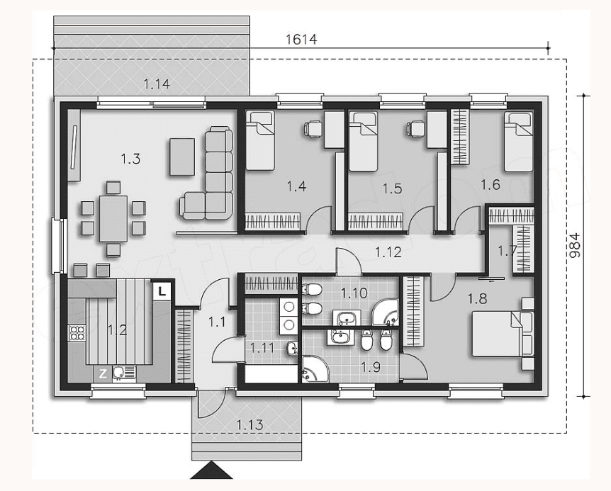 - Общая площадь 146 - Жилых комнат 5 - Габариты дома : 16 х 10 м - Дом одноэтажный - он безопасен для детей, подходит для пенсионеров и людей с ограниченными возможностями. Терраса создает чувство единения с природой